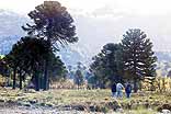 | TESORO.- Los pehuenches cuidan con orgullo las centenarias araucarias que hay en Ralco. El volcán Callaqui, con su cumbre siempre nevada, y el macizo cordillerano La Blanca se observan al fondo desde el sector Vegas de Ralco. |