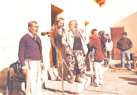 ![]() EN LA ESCUELA. Un grupo de mapuches reunidos con su lonko (autoridad regional) en los preparativos para concretar la grabación. |