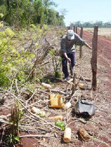 5) Basura tóxica de Mecanizadas: Los envoltorios, y envases de agro tóxicos utilizados por los brasileños son tirados a la vera de caminos, nacientes y arroyos con total impunidad exponiendo al peligro con la contaminación a quienes realmente vivimos y deseamos hacerlo por el resto de nuestras vidas en estas tierras. Para muestra acompañamos muestras de envoltorios recogidos.