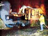 | Reducido a escombros resultó este inmueble de propiedad del empresario Fernando Léniz, en el fundo Chauquén Alto, a 6 kilómetros de la comuna de Panguipulli, Décima Región. El abogado Alejandro Medina interpuso una querella criminal contra quienes resulten responsables de este acto. A pesar de los esfuerzos de bomberos, la vivienda quedó totalmente destruida. |