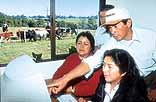 | Dificultades para manejar el "mouse" y entender la función del computador son algunos de los problemas que han tenido que enfrentar los agricultores de la X Región que se embarcaron en la aventura de aprender Internet. En la foto, los alumnos Marisol Nilián, Sylvia Báez, Sergio Hidalgo y Herwin Arriagada se esfuerzan por entender un instrumento que les era desconocido en medio del paisaje campestre del lugar. El curso se realiza en el INIA Remehue, a ocho kilómetros de Osorno. |