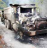 | Completamente destruidos resultaron los dos camiones y una retroexcavadora a raíz del atentado incendiario perpetrado en el Alto del Biobío. Uno de los conductores quedó con lesiones leves. |