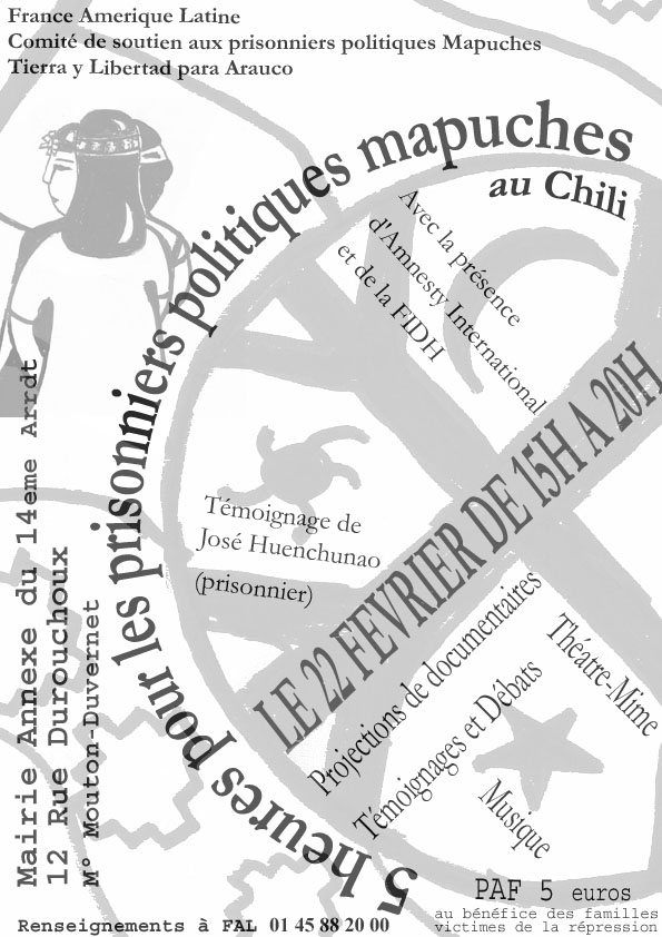 Le 22 fevrier en solidarite aux prisonnier politiques Mapuches, avec la participacion de Amnesty International et la F.I.D.H. Comité Tierra y Libertad para Arauco