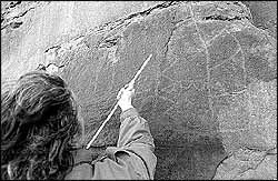 PASO DE LOS INDIOS (Enviado especial).- Los frisos grabados de este paraje perdido están en una galería de roca, debajo de un enorme farallón de piedra basáltica de más de quince metros de alto.