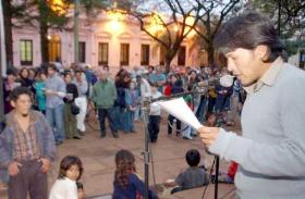 Los aborígenes que se encuentran desde hace 25 días reclamando por sus derechos en la plaza 9 de Julio hicieron público su postura ayer en un acto que convocó al público en general y reafirmaron su voluntad de permanecer en Posadas hasta que el Gobernador los reciba. Los aborígenes recordaron al menos tres pedidos concretos: la remoción del Director de Asuntos Guaraníes Arnulfo Verón, la derogación de un decreto que reconoce al consejo de ancianos y a los guías espirituales como interlocutores con el Gobierno cuando esa tarea le corresponde al consejo de caciques y por último, el diálogo con Carlos Rovira. Territorio Digital (Posadas), 23 de septiembre de 2004.
