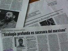 Durante la última semana algunos medios de comunicación han bombardeado sus páginas con sugerentes artículos y entrevistas donde se intenta hacer una clara relación entre lo que es la ecología profunda, el ecoterrorismo, el marxismo y el caso Ralco. La intención parece clara: que todas estas palabras y sus consiguientes significados sean uno, a fin de reducir la defensa ecologista a actos izquierdistas proclives a acciones terroristas. RESPUESTA DE ECOLOGISTAS ANTE CAMPAÑA DESINFORMATIVA DEL "CIENTISTA" SR.MARTINEZ