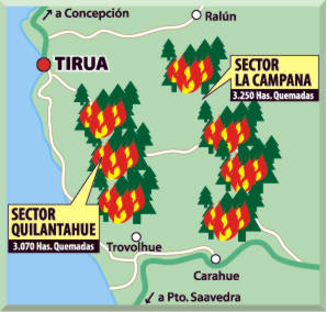 ''El caso más dramático lo viven cerca de 60 familias mapuches que perdieron plantaciones forestales que habían obtenido mediante crédito Indap y que quedaron sin nada'', sostuvo Adolfo Millabur, alcalde de Tirúa. Seis mil hectáreas de matorrales y plantaciones de pino han quemado dos focos de incendio que atraviesan sin control y en forma paralela la comuna de Tirúa, llegando el fuego hasta los límites de la Novena Región. Diario El Sur, 26 de febrero de 2002