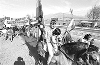 La marcha que organiza el Consejo de Todas las Tierras, denominada "Por el Reconocimiento de Nuestros Derechos Territoriales", está a las puertas de Santiago. Son 120 personas -90 hombres y 30 mujeres- que salieron de Temuco el 27 de mayo con un solo norte. Llegar hasta La Moneda para entregarle al Gobierno un conjunto de propuestas sobre los derechos del pueblo mapuche. "Derechos -dice el lonco Fernando Pérez, quien ayer hacía de portavoz del grupo- que nos corresponden como nación y que nos han sido negados por muchos años". En Santiago, en tanto, el encargado del Departamento Campesino Indígena de la CUT, Adrián Fuentes, señaló que hoy los mapuches pernoctarán en el complejo El Canelo de Nos para continuar a primeras horas del domingo hacia la Plaza Almagro, donde esperan llegar a las 13 horas.Tercera en Internet, 19 de Junio de 1999