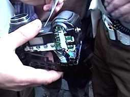 | La cámara digital destrozada durante el ataque, mientras es inspeccionada por Carabineros. | ![]() |