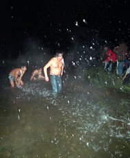 Con un ''¡ya, mis valientes!'', el jefe mapuche arengó a los cuatro mocetones que, justo a la medianoche y semi desnudos, se lanzaron a las aguas del estero Calebu. El resto, se desprendía de las energías negativas mojando sus rostros o lavándose las manos mientras las mujeres tiraban piedras a las gélidas aguas y el lonco Miguel Leviqueo Silva, alzaba al cielo el kuy kuy.