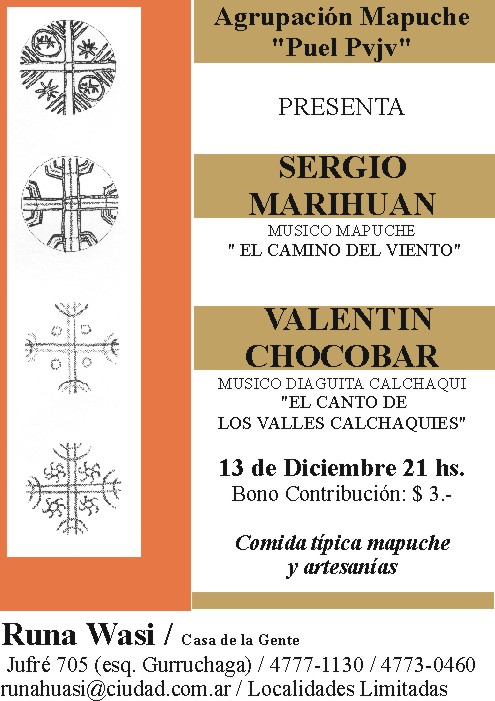 Recital SERGIO MARIHUAN Músico Mapuche, Presenta: “el camino del viento”. VALENTIN CHOCOBAR Músico Diaguita Calchaqui Presenta: “EL CANTO DE LOS VALLES CALCHAQUIES” Centro Cultural Runa Wasi. Jufré 705 esquina Gurruchaga, Cap. Fed. Argentina. Organiza: Agrupación Mapuche “Puel Pvjv” Bono Contribución: $ 3.- Comida típica mapuche y artesanias Viernes 13 de Diciembre 21 hs